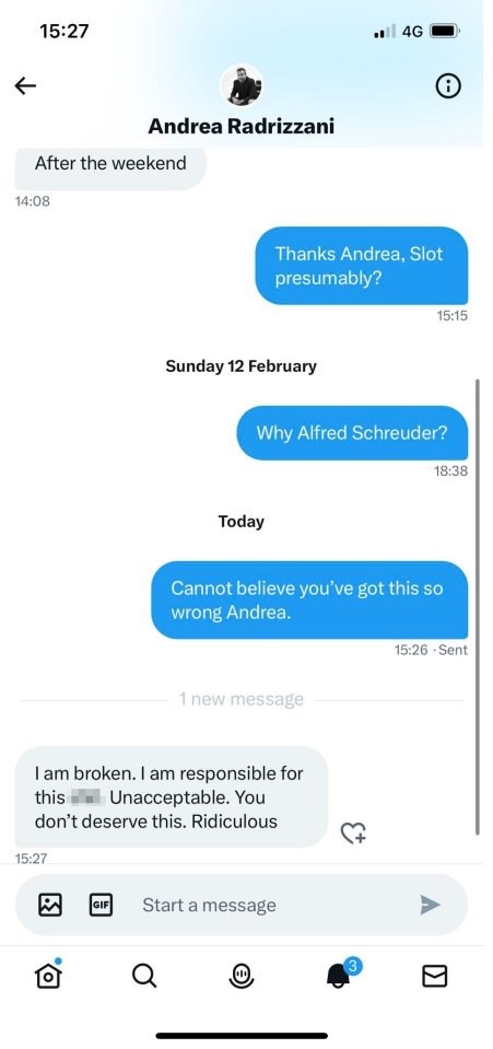 Następnie McGilligan udostępnił nowe zdjęcie potwierdzające, że Radrizzani śledzi go na Twitterze, a także zrzut ekranu jego wiadomości z szefem, aby dostarczyć dalszych dowodów na to, że wiadomości były uzasadnione.